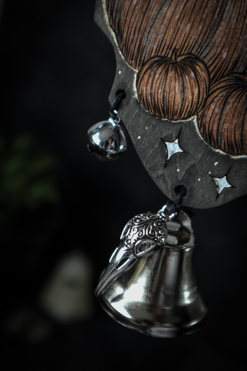 Witch bells are traditionally hung on the door or door knob to disspell negativity before it can enter a home or establishment with the vibrational sound of the bells thought to cast out impure energy. These natural handcut wood plaques, are woodburned with a skeleton raven, pumpkins, cemetery gravestones, and a gothic victorian lantern on a 12x17.5cm plaque with one large silver bell, raven skull charm, and two mini bells. Possibly the perfect spooky season witch bells for Halloween to guard your home from the spirits of beyond.