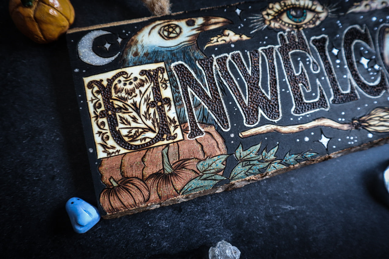Keep unwanted guests away with this medieval inspired Woodburned door sign with “Unwelcome” lettering, skull raven, pumpkins, graveyard, all seeing eye, witch broom, crystals, moon and more! . This sign is Smokecrafted in Suffolk, England where it measures 25cm long snd 11cm wide, and includes a rope for hanging onto door or wall. This item is made to order and includes hand painted details, as well as sparkle accents.