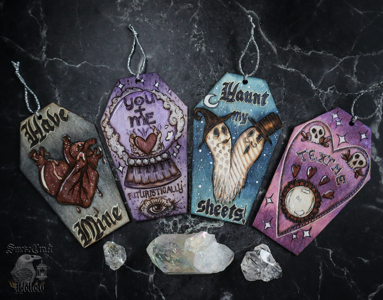 Spread the spooky love with this super cute Woodburned coffin with these adorable Ouija spirit board planchette, on a wooden casket Valloween ornament with the phrase: “Text me”. Hand Woodburned and painted with shimmering pink, red and white accents, this spooky Valentine’s decor is the perfect gift for your goth, spooky, witchy inclined friend or lover! Limited availability and made to order. Xoxo Be sure to check out the whole collection of these limited edition valloween ornaments!