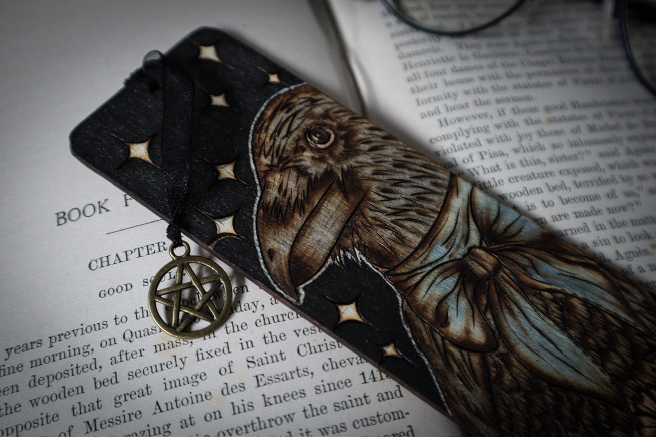 Original pyrography art woodburned on a natural, wooden bookmark measuring 5cmx15cm with black ribbon, and bronze coloured pentagram pendant charm. Call all the witchy, cottagecore bookworms!