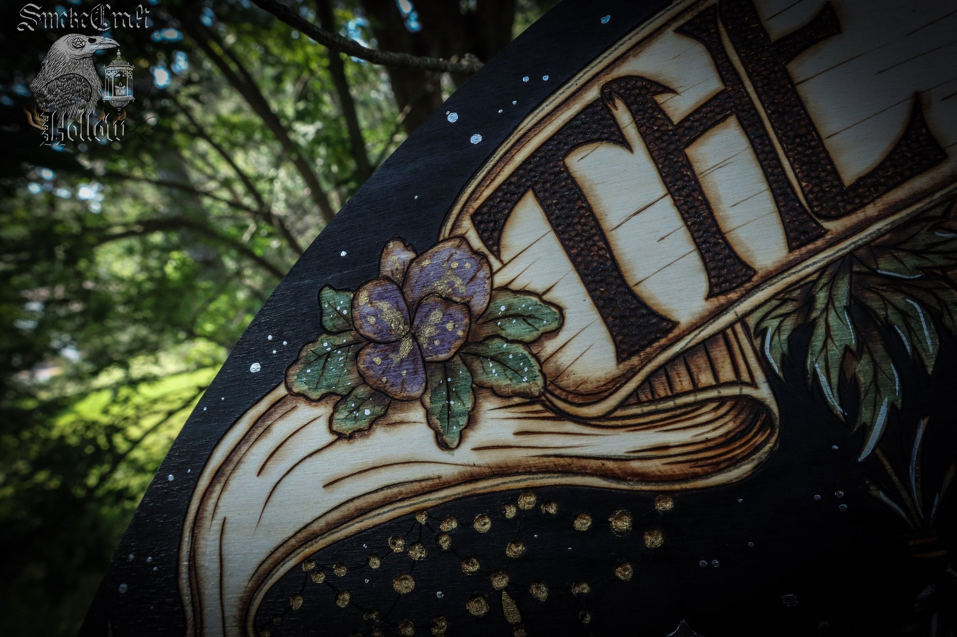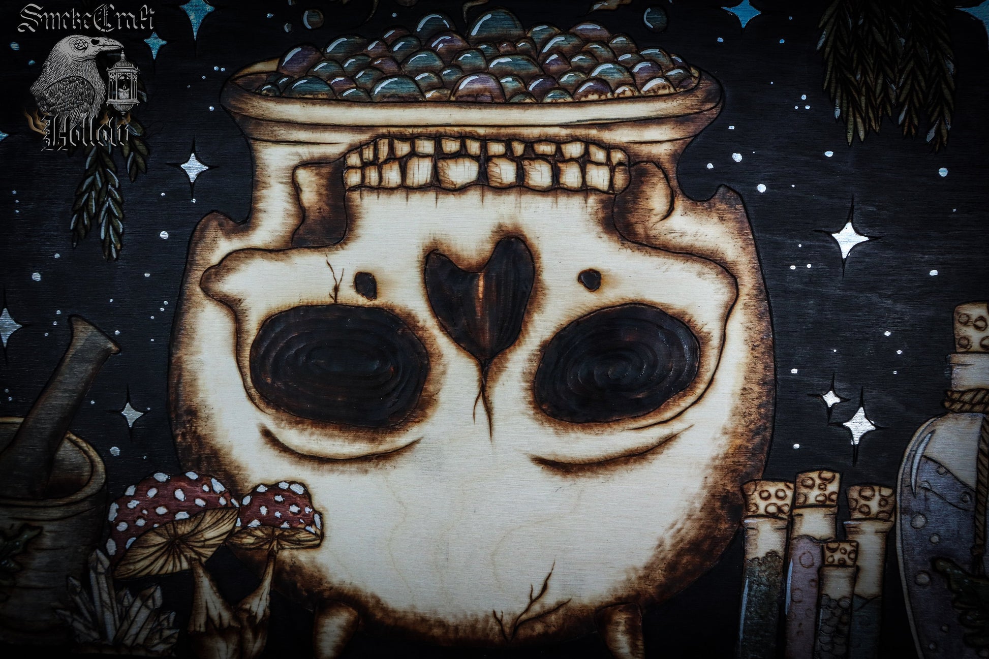 This gorgeous Woodburned witchy sign was an original design for a custom order but I loved how it turned out so much, that I thought I would offer a smaller and more affordable version for those interested. This version is burned on a thin, wood plaque measuring 18inches by 9 inches, and includes: mushrooms, crystals, potion bottles, pumpkin mushroom, skull cauldron, ferns, florals and more details with gold and silver accents. This would be the perfect edition to any spooky home either in the kitchen or somewhere in your living space. Versatile it can be used all year round or just for the spookier months. This edition will also include hanging fixtures. Smokecrafted in 8 hours and shipped within 3-5 business days depending on order queue.
