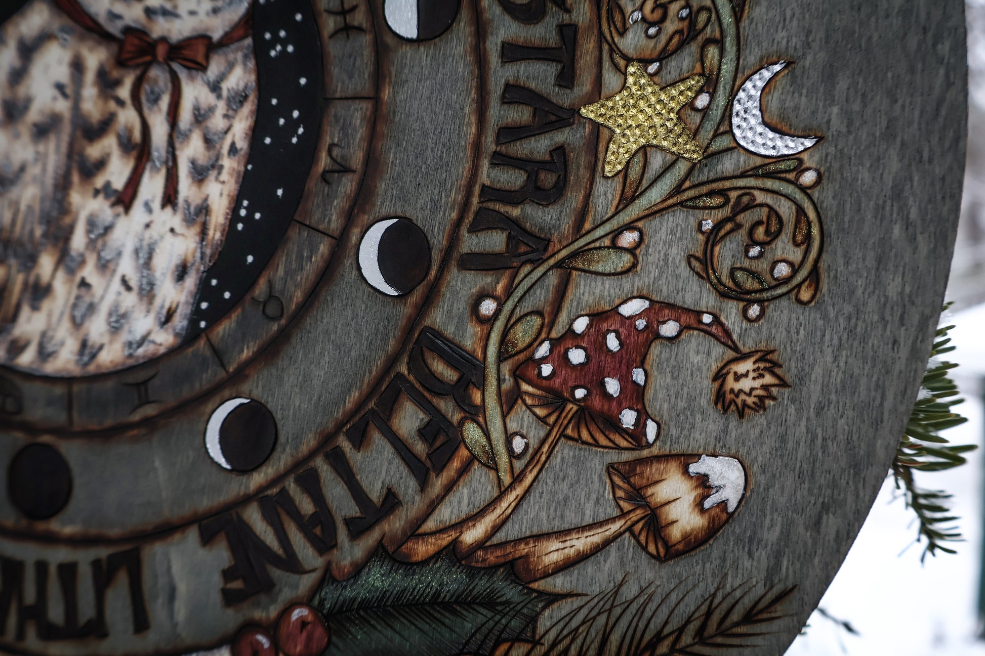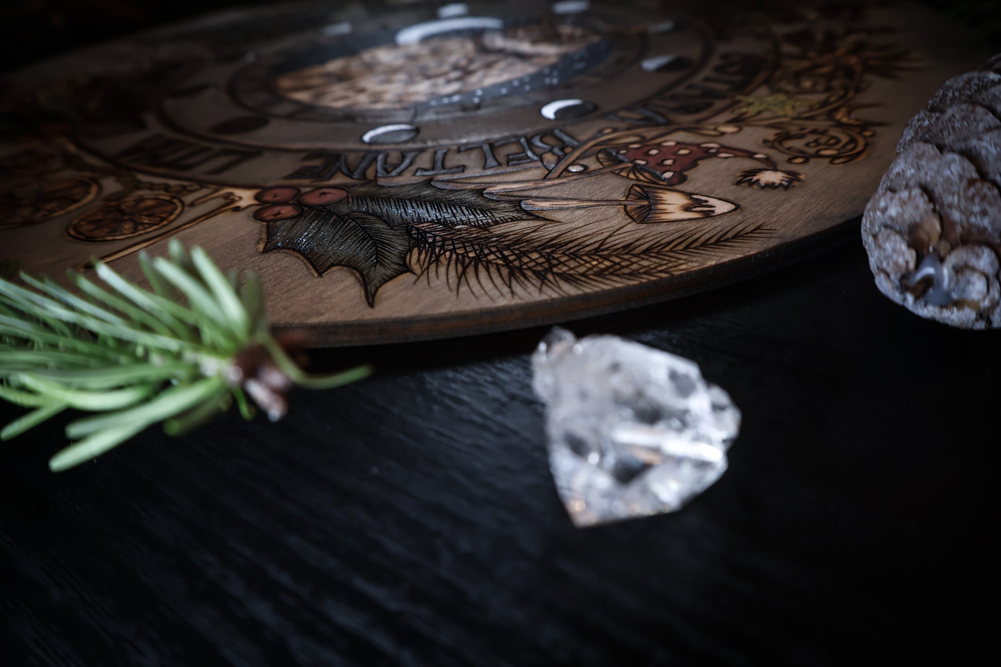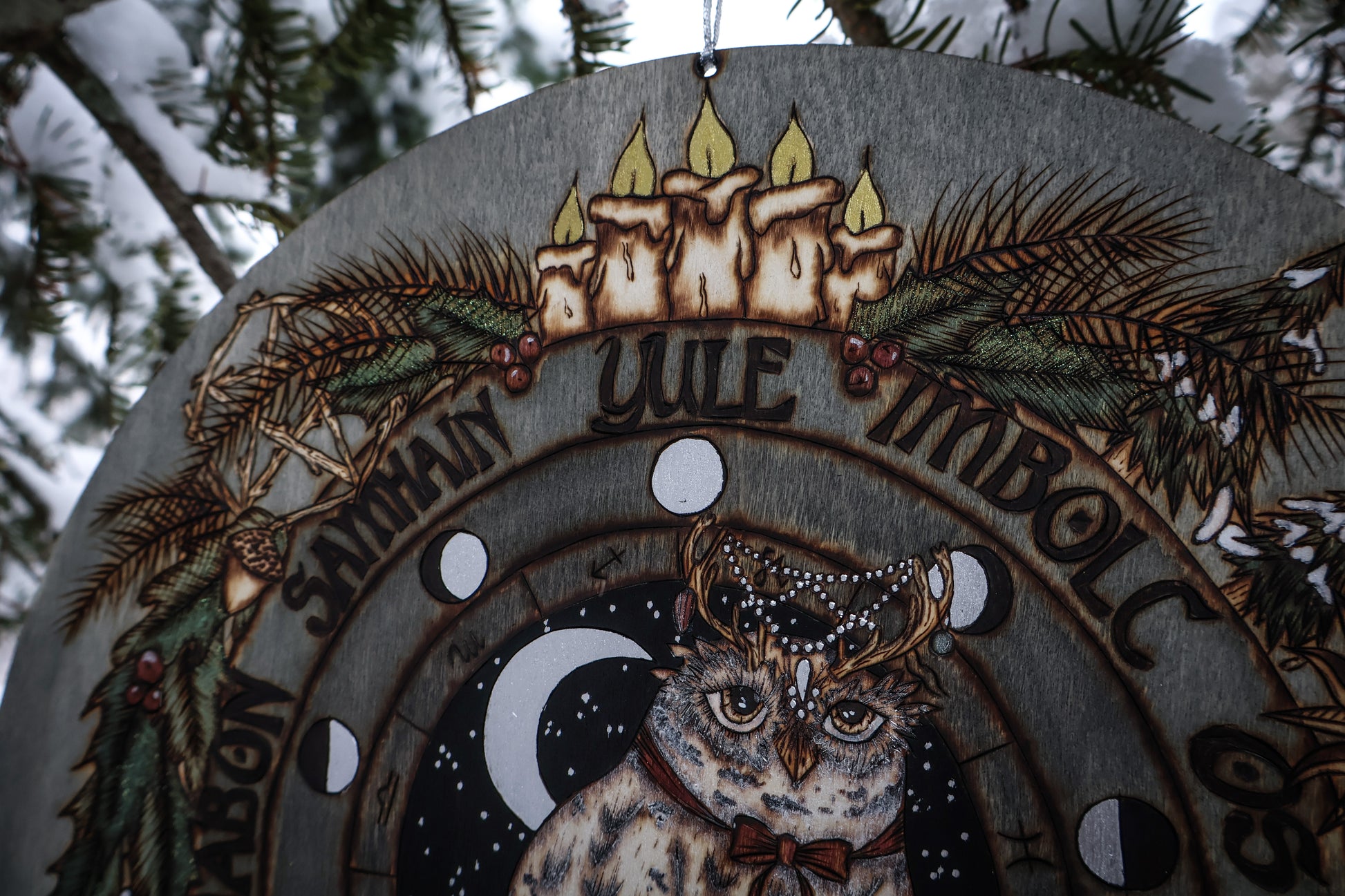 This hand-woodburned, pagan Wheel of The Year is Yule or Witchmas (Christmas) themed to invoke the energy of the holiday seasonwith sabbaths, moon phases, snowy owl, stars, ivy, sun, and more! This item is also hand-painted which includes iridescent shades and gold sparkles. Smokecrafted and finished in 8 hours, this yuletide wall hanging is woodburned on a 30cm wood circle that is about 3mm thick. Celebrate yule with this wheel of the year, place it in your home or above your altar. Fancy collecting all eight sabbath wheels?