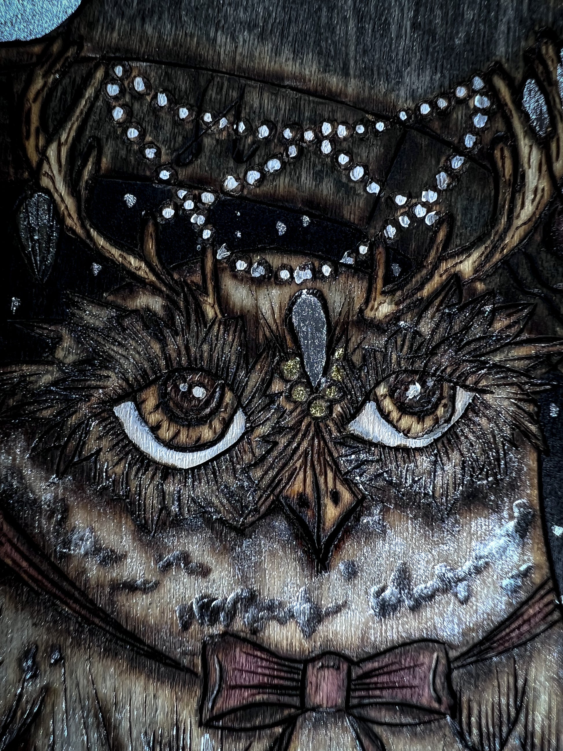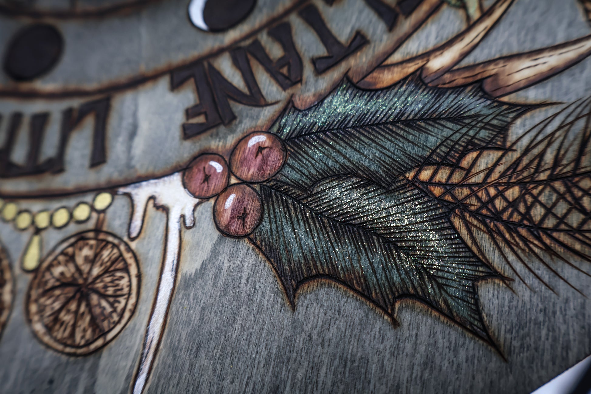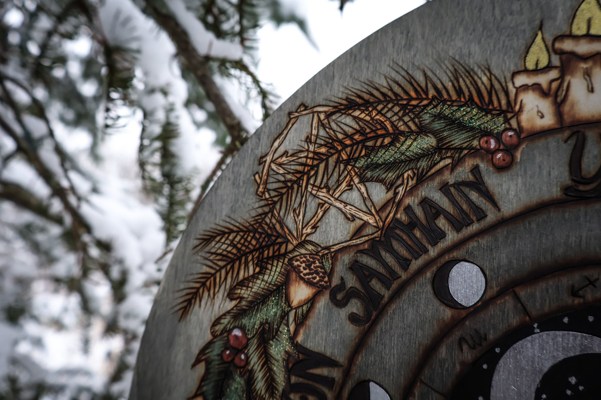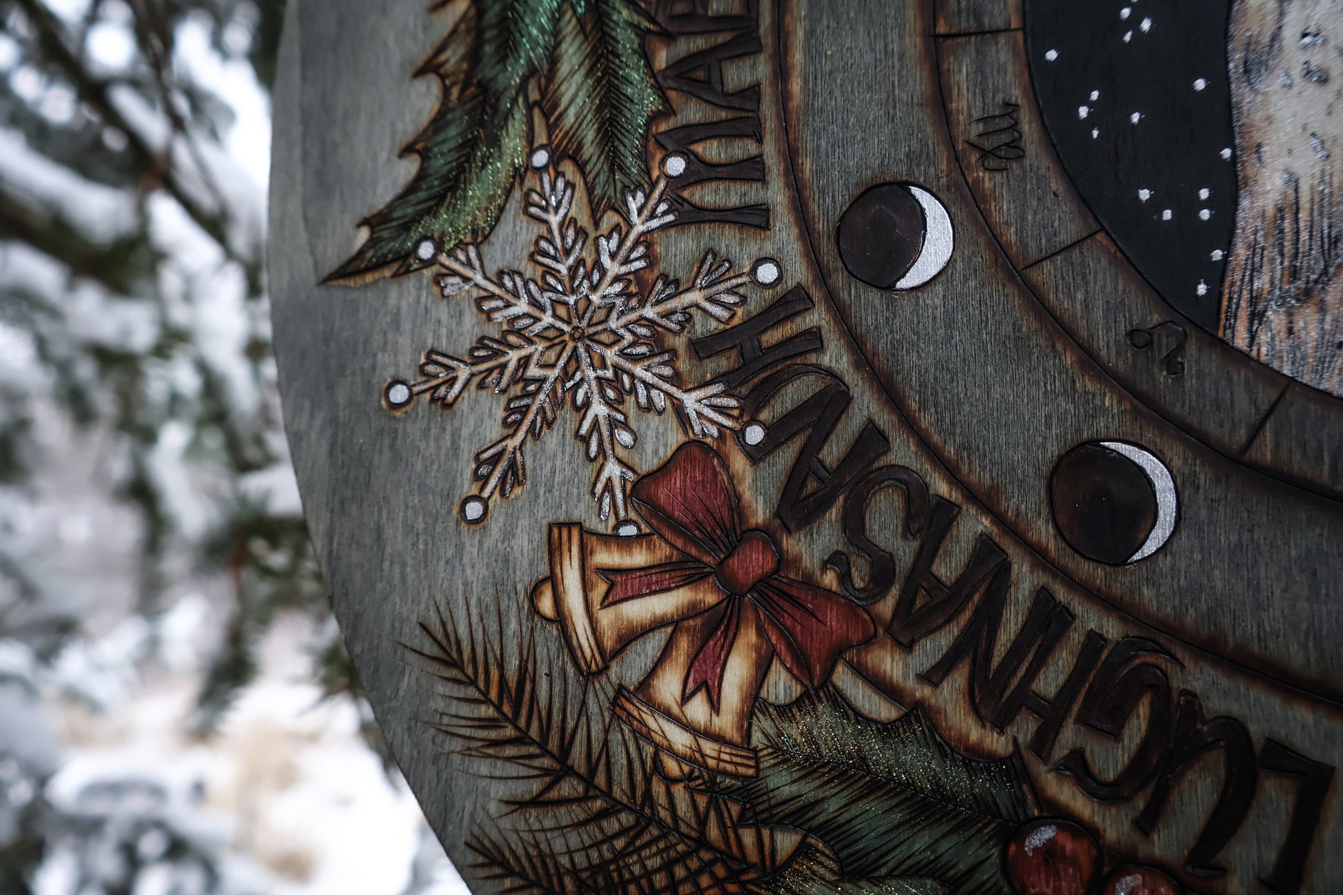 This hand-woodburned, pagan Wheel of The Year is Yule or Witchmas (Christmas) themed to invoke the energy of the holiday seasonwith sabbaths, moon phases, snowy owl, stars, ivy, sun, and more! This item is also hand-painted which includes iridescent shades and gold sparkles. Smokecrafted and finished in 8 hours, this yuletide wall hanging is woodburned on a 30cm wood circle that is about 3mm thick. Celebrate yule with this wheel of the year, place it in your home or above your altar. Fancy collecting all eight sabbath wheels?